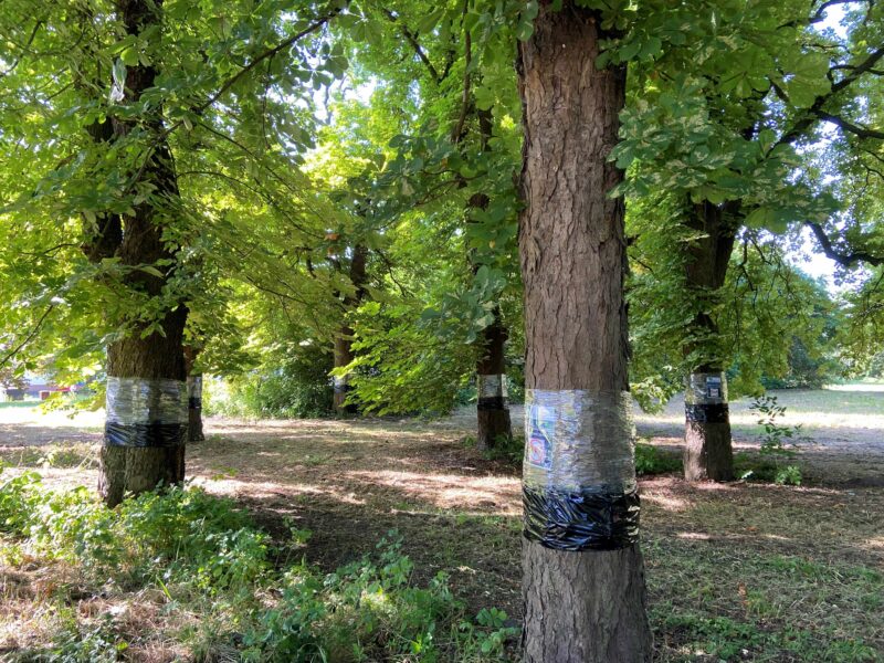 Wdzięczność pracownikom Instytutu za podjęcie działań ochronnych zabytkowych drzew! Opasanie drzew wczesną wiosną folią owadobójczą służy zatrzymaniu wędrujących po korze drzewa poczwarek szrotówka zimujących i wylęgających się w opadłych jesienią liściach. Jest to jedna z metod ograniczania populacji tego szkodnika. Kolejną jest zawieszenie na gałęziach drzewa pojemników – pułapek przyciągających motyle szrotówka i ograniczające liczbę larw składanych w liściach kasztanowca. W tym roku wegetacja ruszyła wcześniej a ciepły klimat powoduje, że szrotówek może nawet 4 krotnie przejść cykl rozmnażania. Przylepne folie mają jednak mankament, są zabójcze także dla innych owadów, które do nich przylecą.