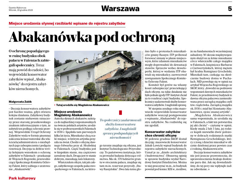 Gazeta Wyborcza Stołeczna 19_12_2023_s.5 Abakanówka pod ochroną