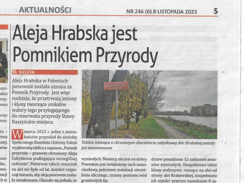 Tygodnik „Przegląd Regionalny” informuje, że zabytkowa Aleja Hrabska ponownie została oznaczona jako Pomnik Przyrody prawem chroniony.